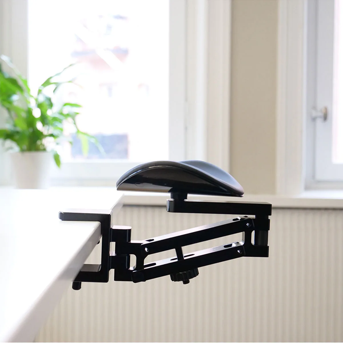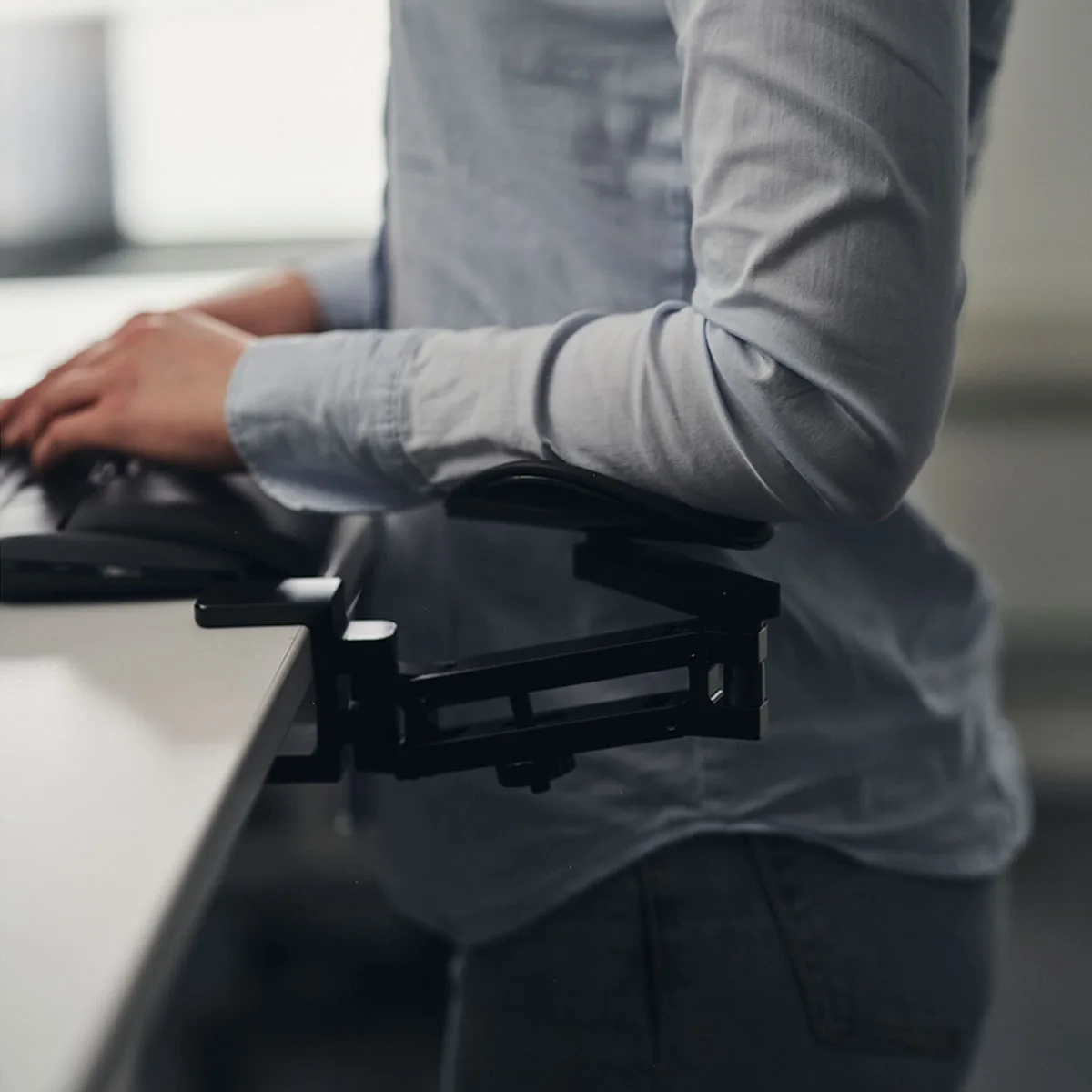 Le support de bras Ergo Dynamic fonctionne comme une extension naturelle du bras. Grâce à son système articulé, il accompagne les mouvements de l’avant-bras sans résistance ni rupture, permettant de travailler de façon plus fluide et détendue. Son système comporte plusieurs points de rotation, au niveau de la fixation sous le bureau, du bras de support et de la gouttière d’appui, assurant un suivi naturel des mouvements. En prenant en charge le poids du bras, il limite les tensions statiques au niveau des épaules et de la nuque et favorise une posture plus neutre. Le bras reste soutenu, mobile et aligné, ce qui améliore le confort au quotidien et réduit la fatigue lors d’un usage prolongé du clavier et de la souris.
