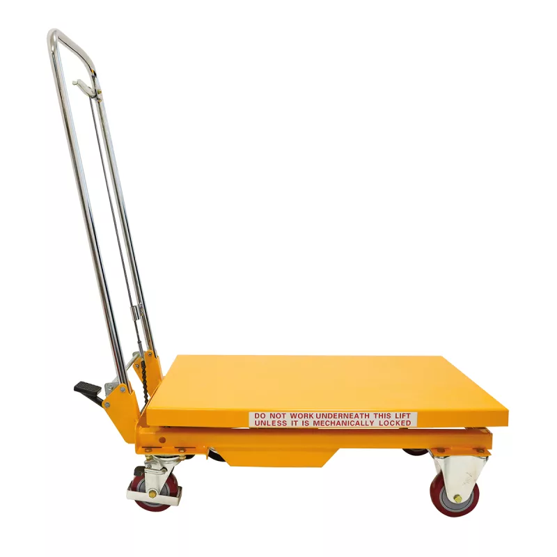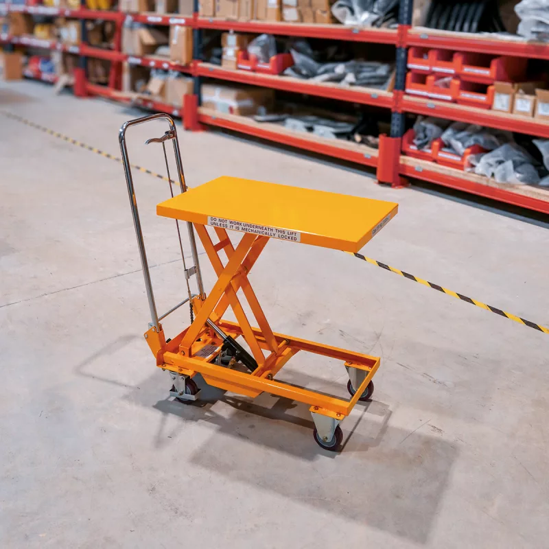 La table élévatrice mobile E150 permet de soulever et déplacer vos charges jusqu’à 150 kg en toute sécurité. Son système hydraulique à pédale assure un réglage de hauteur simple, tandis que la poignée de frein garantit une descente fluide.